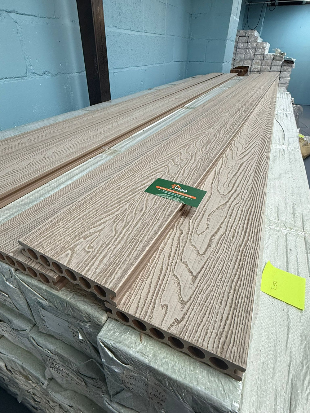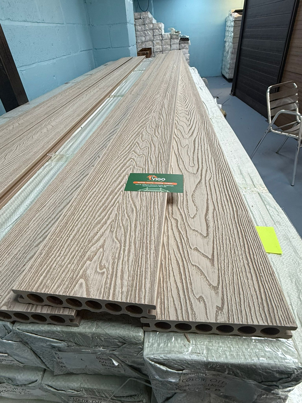 One board covers ≈ 0.42 m² allowing for a 6 mm expansion gap. Fix to Vigo composite or treated timber joists at 350–400 mm centres.