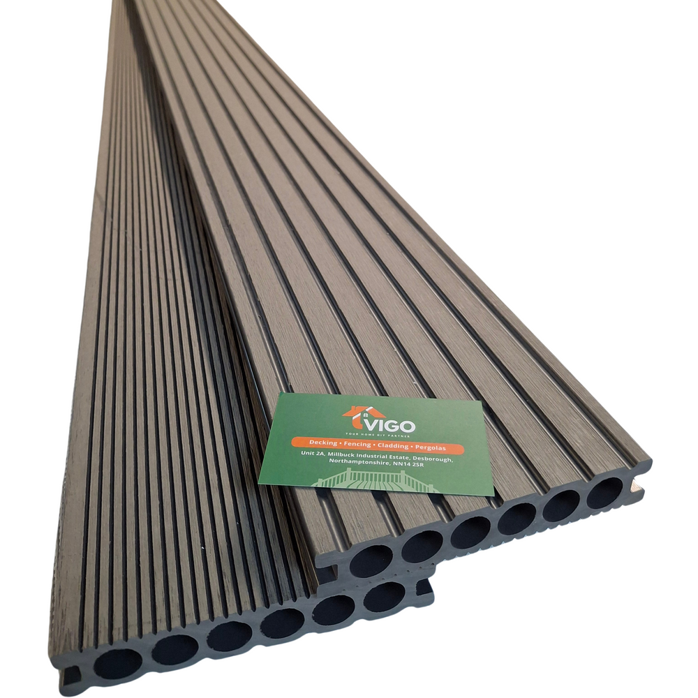 One board covers ≈ 0.42 m² with a 6 mm expansion gap. Fix to Vigo composite or treated‑timber joists at 350–400 mm centres.